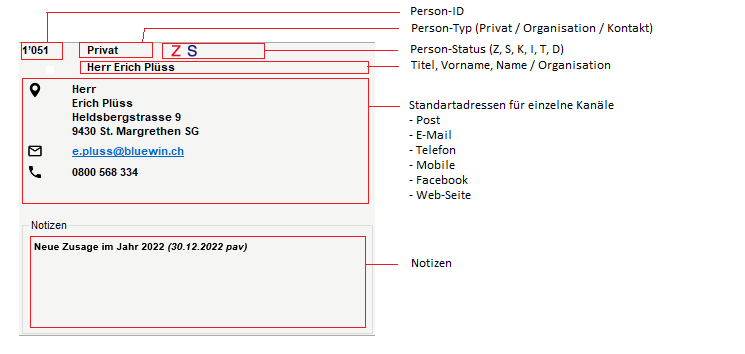 - Person, wichtigste / Standard-Kommunikationskanäle und Notizen.