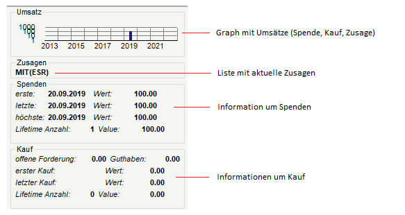 - Finanzielle Gesamtübersicht für jedes Jahr, grafisch dargestellt und nach Bereichen geordnet: Käufe, Spenden und Zusagen.