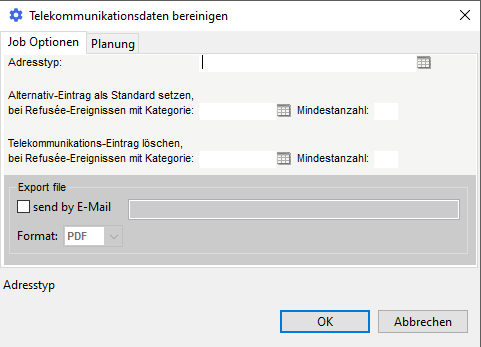 Hier werden für jede Adresse der "Standard"-Eintrag bereinigt und Adress-Einträge gelöscht. Wenn pro Adresstyp ein Eintrag die einzugebende Anzahl oder mehr Refusé-Ereignisse hat, wird der "Standard"-Eintrag zu einem anderen Datensatz des gleichen Adresstyps verschoben. Für solche, die nicht verschoben werden können, wird eine Liste ausgegeben, die manuell bearbeitet werden kann.