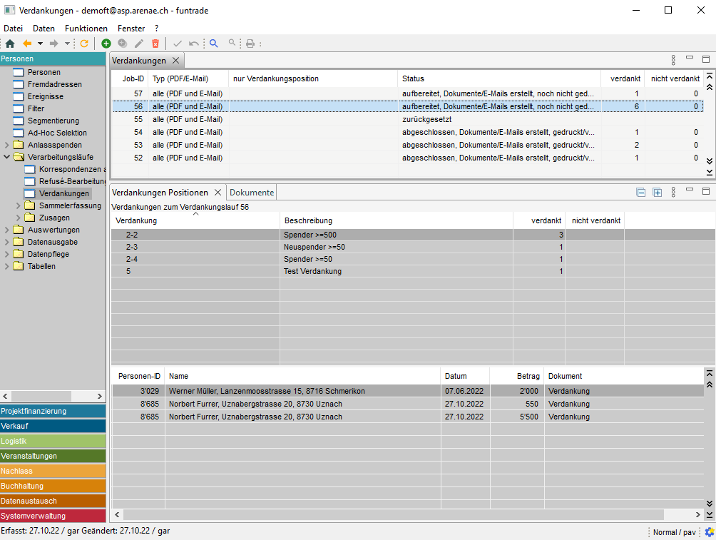 Nach der Bearbeitung werden in der Maske «Verdankungen Positionen» die Positionen aus der Verdankungssteuertabell mit der Anzahl der erstellte Verdankungen und eine Liste der bedankten Personen erstellt.