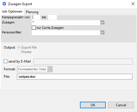 Export von Zusagekarten nach verschiedenen Kriterien wie Zusageart oder Eintrittsdatum. Es lassen sich alle betroffenen Karten, eine Gruppe von Karten nach Personenfilter oder nur nach Corris-Karten exportieren.