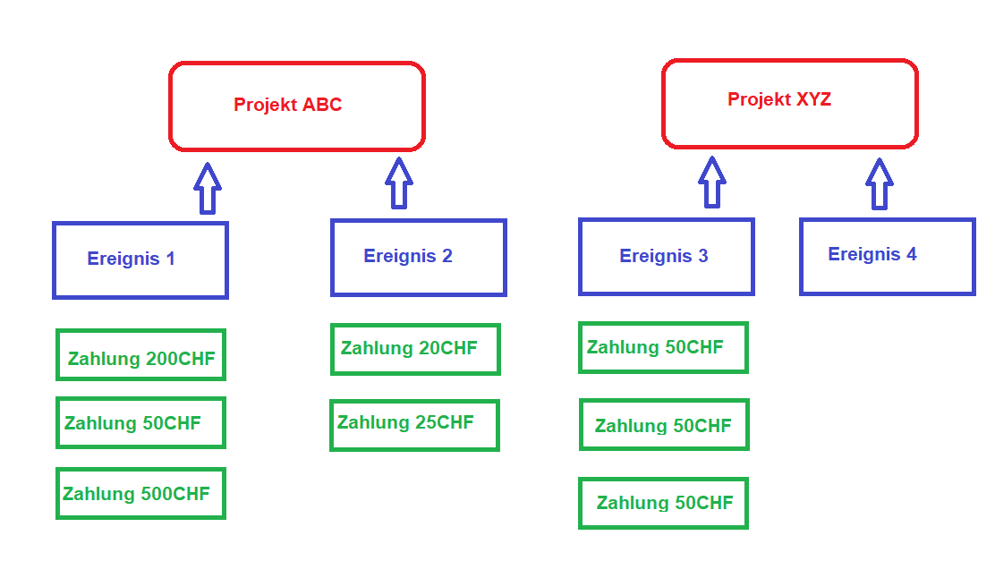Es ist zu unterscheiden zwischen Buchungen (Spenden), Ereignissen und Projekten. Zahlungen sind pflichtig zu einem konkreten Ereignis zu buchen. Die Projekte sind als eine höhere Ebene zu verstehen, welche die einzelnen Ereignisse miteinander verbindet.