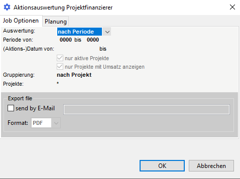Die Auswertung verarbeitet die Aktionen nach der Periode oder nach dem Datum der Aktionen und die Ergebnisse können nach Projekt, Projektfinanzierer oder nach Branche der Projektfinanzierer gruppiert werden.