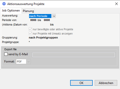 Die Auswertung verarbeitet die Aktionen nach Periode oder nach Datum der Aktionen und die Ergebnisse können nach Projektgruppe gruppiert werden. Hinweis: Eine Projektgruppe beim Projekt wird durch ein Projektgruppenmerkmal definiert.