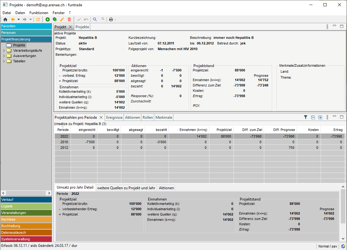 Jeder Betrag, der im Rahmen einer Spendenakquisition einbezahlt wird, kann auf ein bestimmtes Projekt verbucht werden. Damit wird ein kampagnen- bzw. projektgestütztes Spendenmarketing möglich. In den Projekten werden alle Beträge für eine bestimmte Zweckbindung zusammengefasst. Im Projekt werden die Sammelziele (pro Periode) definiert und der Stand der Spendeneingänge ist jederzeit online sichtbar.