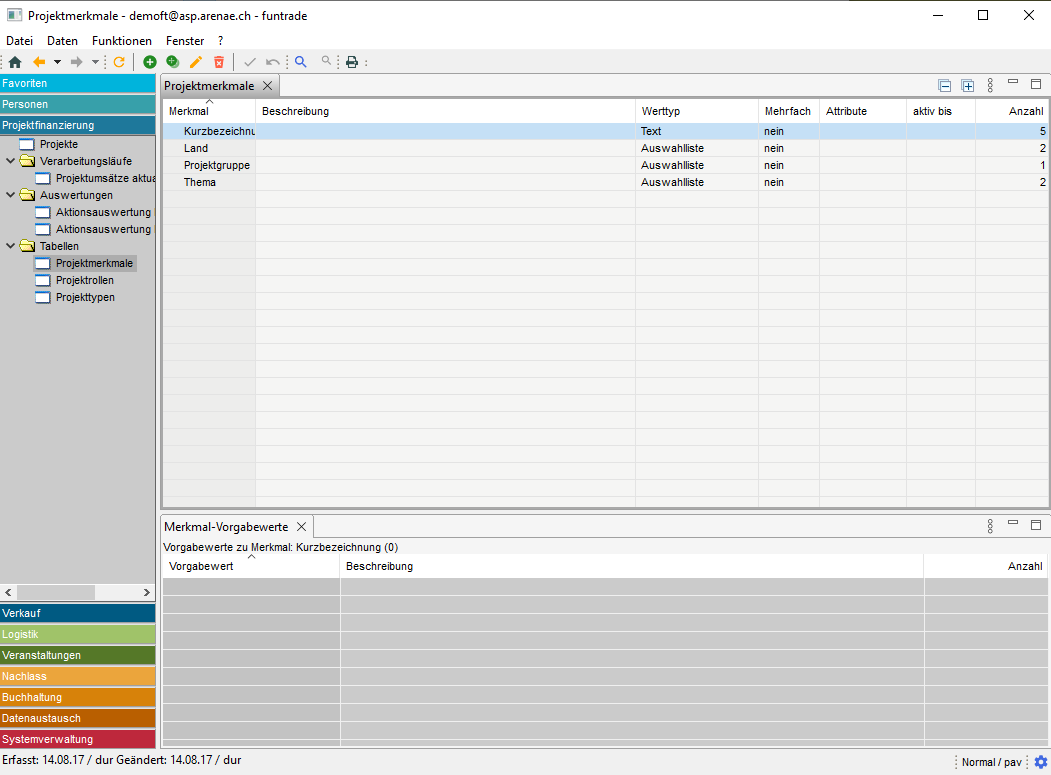 Die Merkmale sind frei definierbar. Ein Merkmale dient als Projektgruppenkennzeichen. Dieses Merkmal für die Projektgruppe ist im Systemparameter «projgrpMerkmalId» definiert.