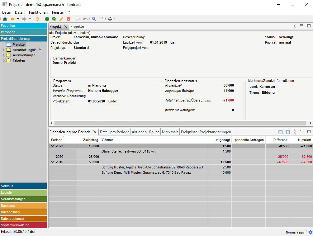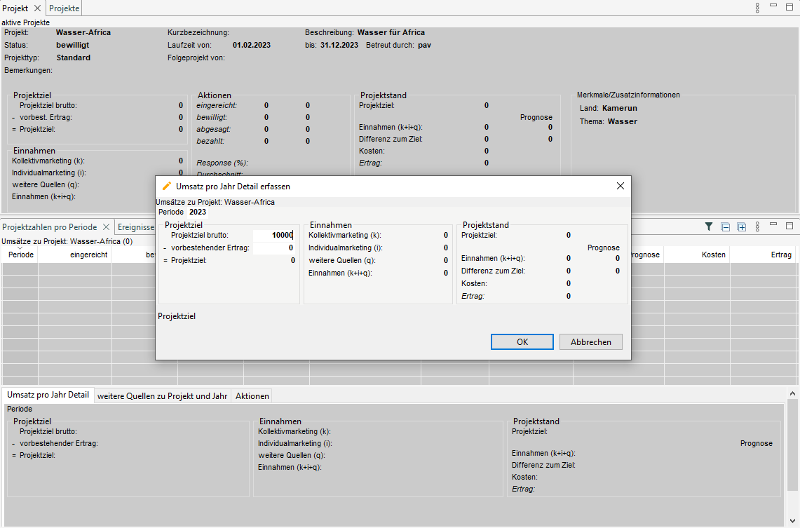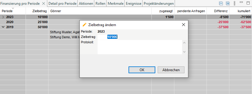 Vor Beginn des Projekts muss der Zielbetrag des Projekts definiert werden. Der Zielbetrag des Projekts lässt sich separat pro Periode in der Maske «Finanzierung pro Periode» oder «Detail pro Periode» definieren.