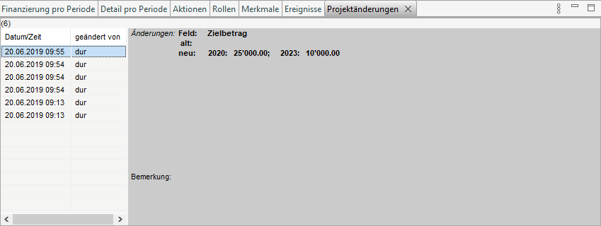 In der Standardversion werden die Änderungen von bestimmten Feldern des Projekts protokolliert. Diese Änderungen sind deshalb dann in der Maske «Projektänderungen» sichtbar.