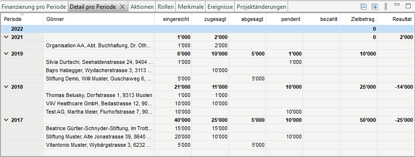 - Projektzahlen pro Periode – Im Vergleich zur obersten Ebene sind hier die einzelnen Beträge nach Jahren gegliedert.