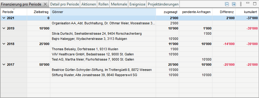 Finanzierung pro Periode – Liste von Aktionen zum Projekt, die zugesagten und/oder pendenten Betrag haben. Die Liste ist in einer Baumstruktur nach Periode geordnet.