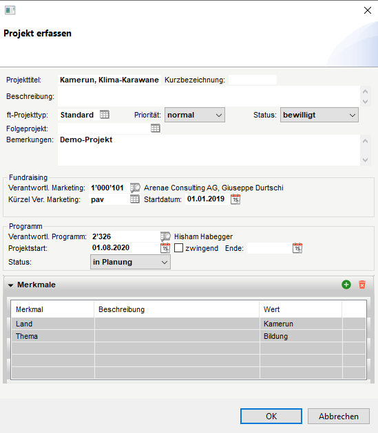 Merkmale / Zusatzinformationen - Hier werden die aktuellen Merkmale und Zusatzinformationen zum Projekt nach der Konfiguration im Systemparameter «projekt-info» dargestellt.