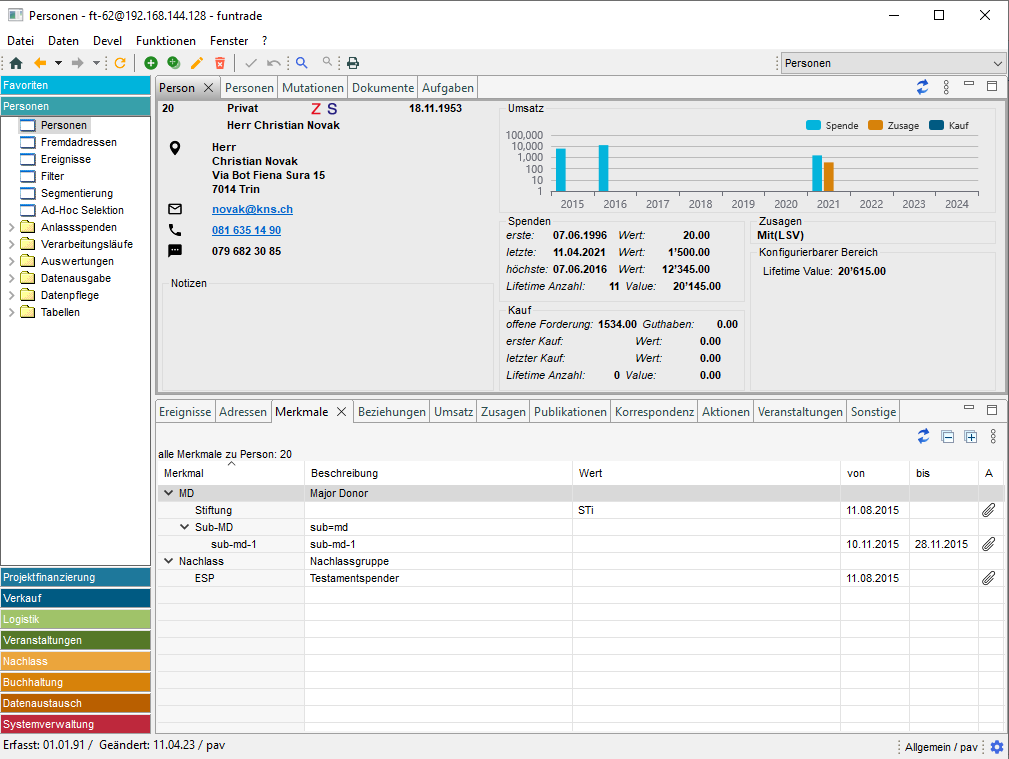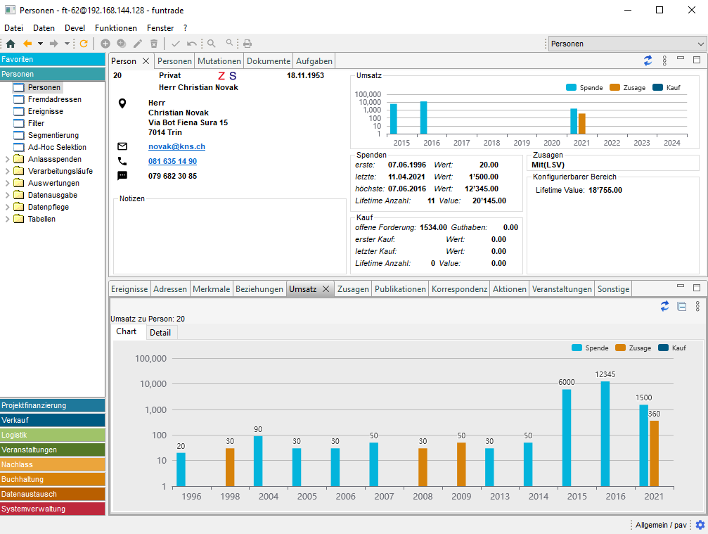 - In der Maske «Person» sind neu die Umsätze durch Spenden, Zusagen und Kauf der letzten neun Jahre in einem Chart dargestellt.