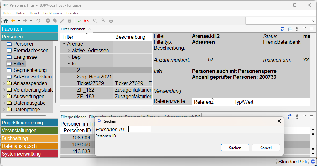 Bei einer grösseren Anzahl Personen in einem Filter ist es für Stichproben und auch für andere Zwecke hilfreich, wenn eine konkrete Person im Filter gesucht werden kann. Dazu ist eine neue Funktion «Person suchen» implementiert.