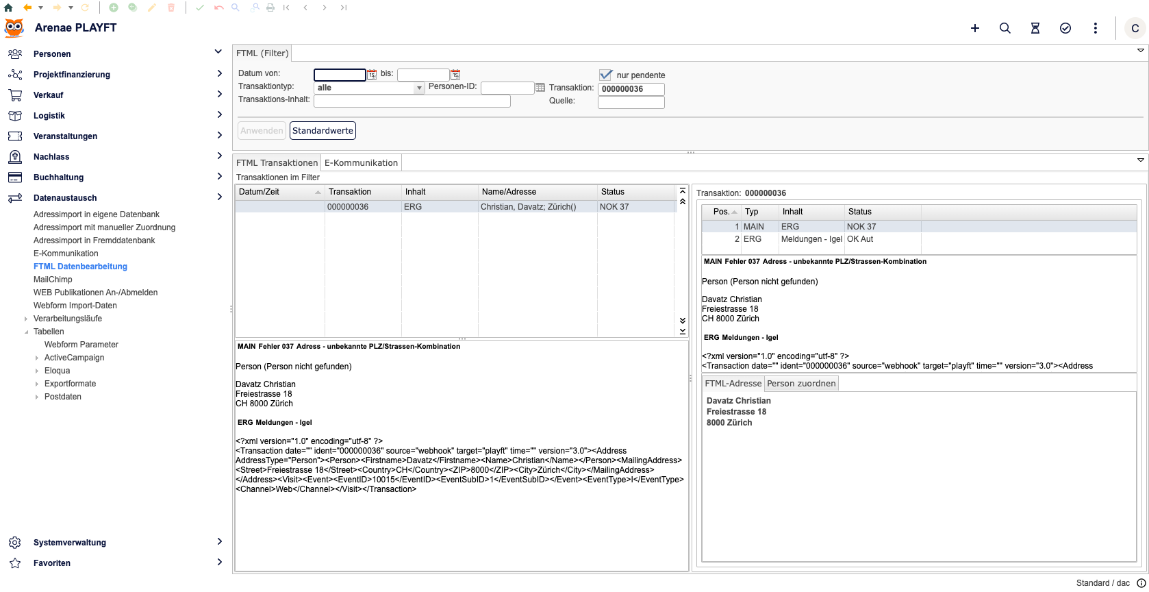 Überprüfe in funtrade, ob die Daten angekommen sind. Der Status „bearbeitet“ zeigt an, dass eine FTML-Transaktion erstellt wurde. Schau Dir die FTML-Daten der Transaktion an, um den Verlauf und eventuelle Fehler zu überprüfen.